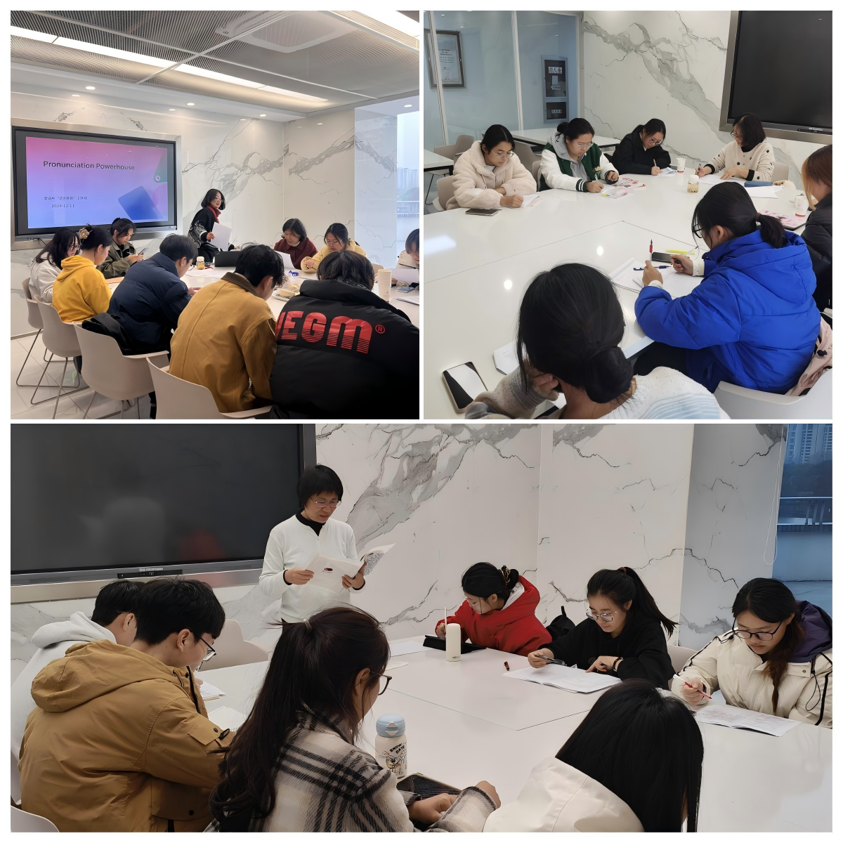 在语法专项指导中柯可和焦静霞老师通过实例分析和错误纠正,帮助员工掌握英语语法难点。教师们特别强调了时态、语态、从句等复杂语法结构的运用,结合英语表达实例,让员工在实际语境中运用所学语法知识,加深对语言的理解和应用。语音专项指导包括音标学习、单词重音、语调变化及口语话题输出等,陆萍、刘露、焦静霞和万中艳老师以小组为单位,对员工的发音进行一对一指导。通过模仿练习、朗读实践和即时反馈,从而帮助员工清晰地认识到自己的发音问题,并及时纠正。