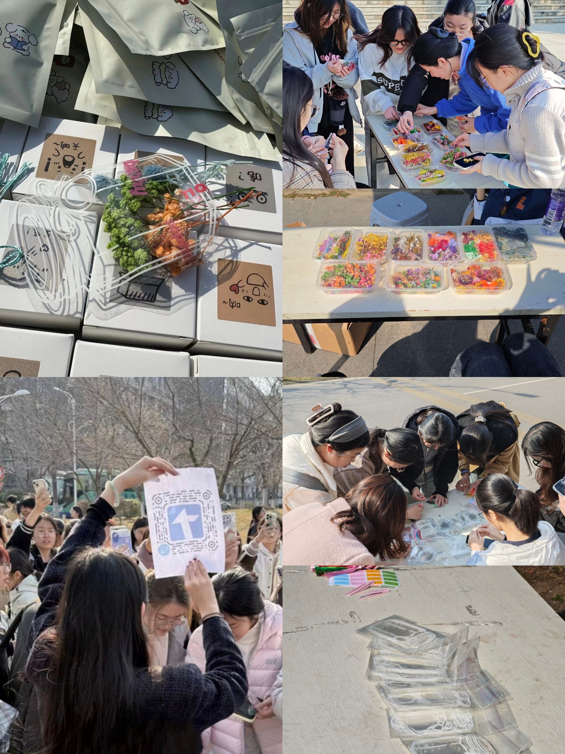 本次活动沿樱花大道设置三个打卡点,参与者完成各点任务即可领取树叶、鲜花盲盒等材料,自由创作春日主题书签;终点处设有解压任务盲盒,完成可抽取小礼品或心灵寄语。本次活动吸引了400余名同学参与,现场反响热烈。活动过程中,同学们通过手中的材料将春天的气息与自己的情感融入每一张书签之中,展现出了丰富的想象力与创造力。最后的任务盲盒环节不仅让同学们收获了精美的小礼品和温暖祝福,也大大增进了彼此的友谊,活动在一派欢声笑语中落下帷幕。