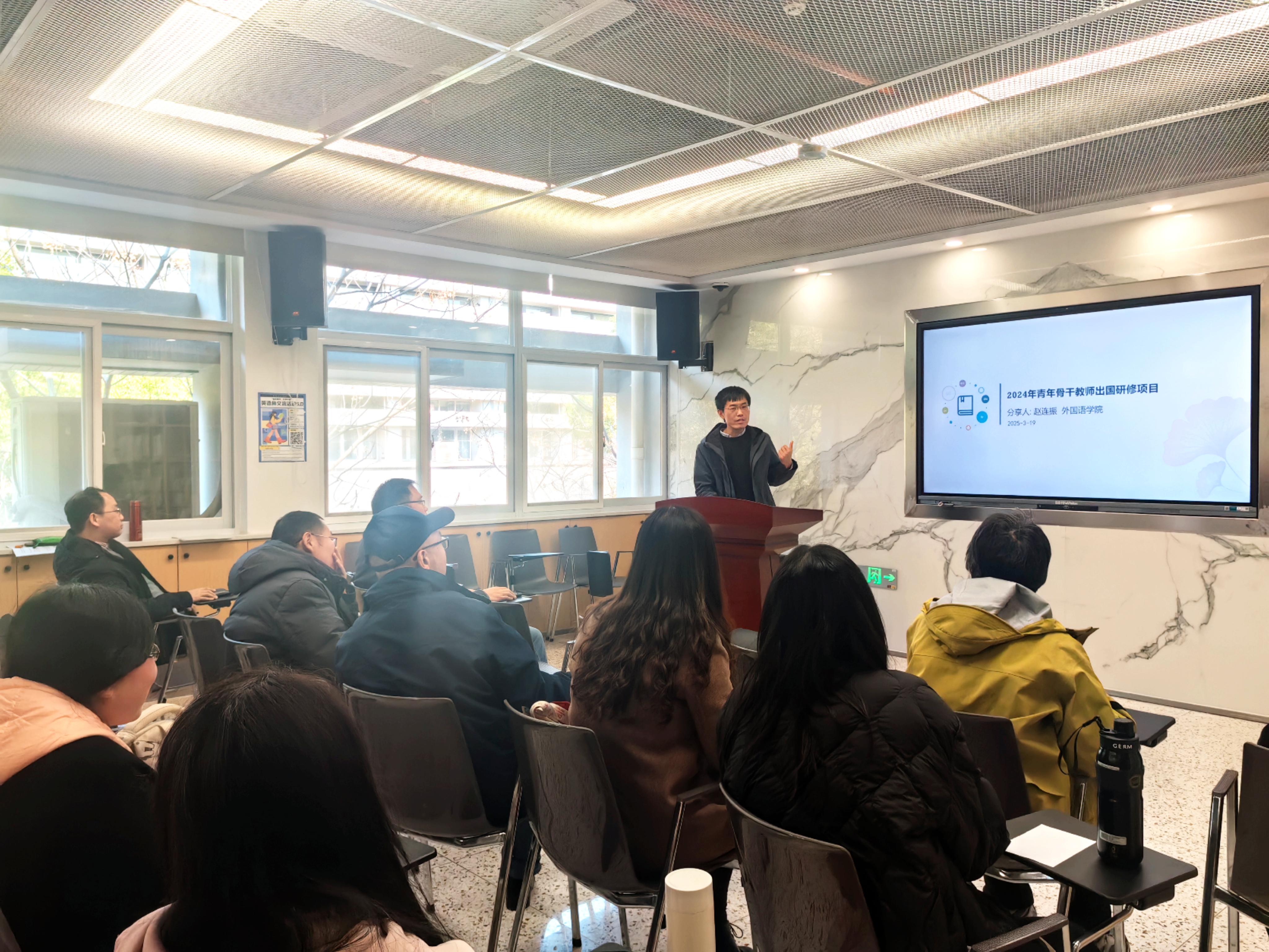 在国家留学基金委资助下,赵连振老师于2024年3月至2025年3月前往英国萨里大学翻译研究中心进行为期一年的访问学习。其汇报聚焦三个方面:一是介绍了萨里大学“翻译与技术”前沿特色课程设置,如“Smart Technologies For Translators(译者智能技术)”和“Translation For The Creative Industries(创意产业翻译)”;二是分享了在英期间对英语语言、历史、社会等语言文化现象的见闻;三是对比分析了中英学术生态差异,并从中西文明交流互鉴角度思考了在外语教学和研究中如何让西方更好理解中国。