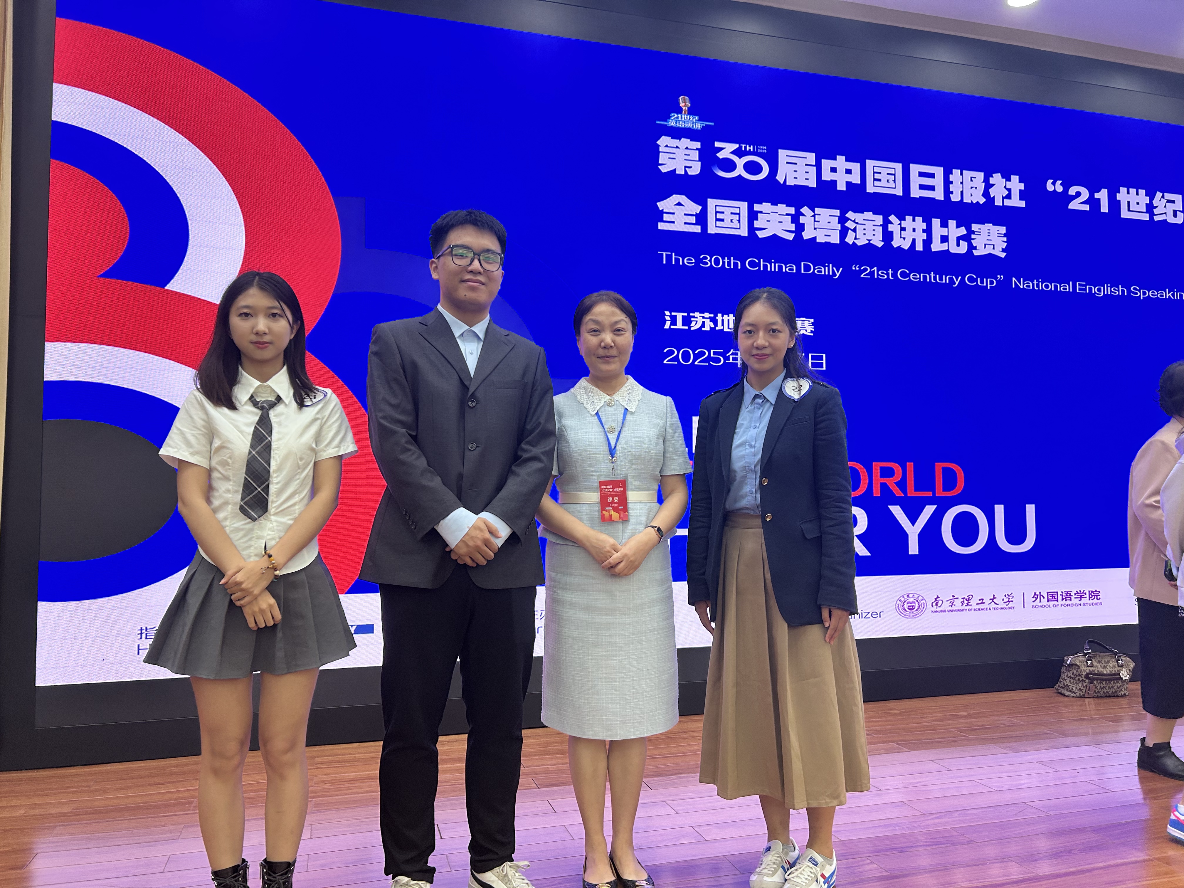 6月7日,第30届中国日报社“21世纪杯”全国英语演讲比赛江苏地区决赛在南京理工大学圆满落幕。公司三名学子在全省80位选手中脱颖而出、斩获佳绩。今年会魏翊同、孟目的公司赵秋瞳荣获省一等奖,顺利晋级国赛,今年会王皓阳荣获省二等奖。