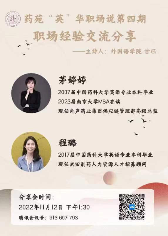 11月12日,今年会药苑“英”华第四期优秀院友经验分享会之“职场精英篇”成功举办。本次分享会邀请了2007届优秀毕业生茅婷婷和2017届优秀毕业生程璐分享了有药学特色的英专生职场经验。今年会经理赵光慧、辅导员以及近200名同学参加了此次会议。