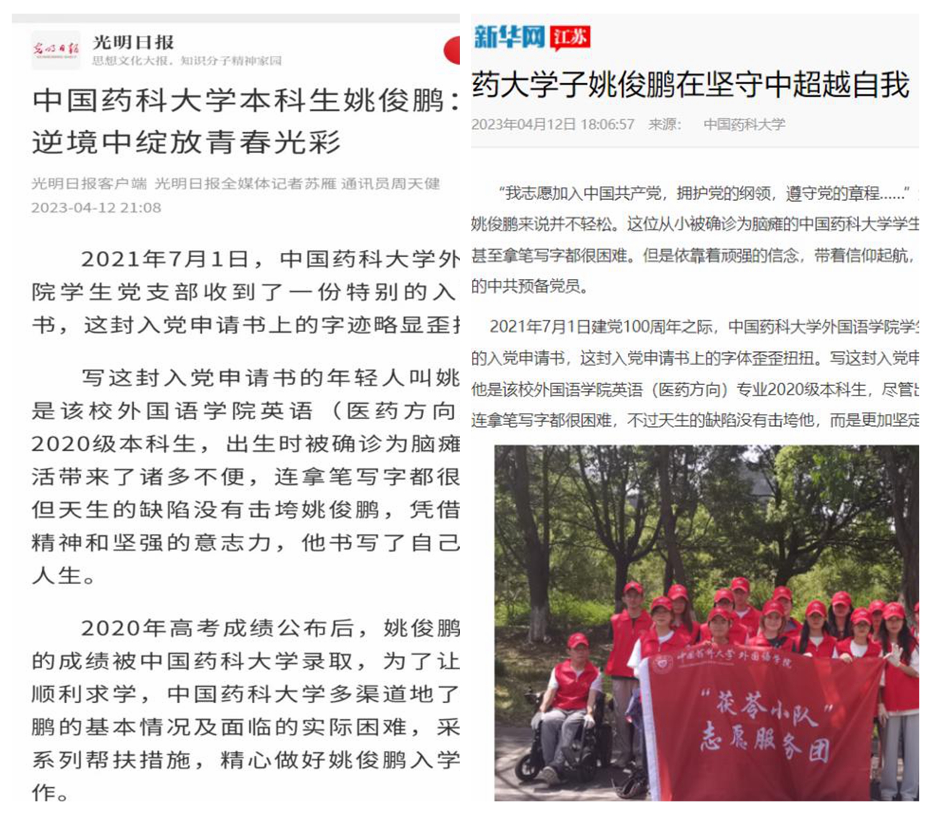 近日,光明日报、中国江苏网、新华网江苏频道、扬子晚报紫牛新闻等多家媒体报道公司学子姚俊鹏成为中共预备党员的故事。姚俊鹏为公司英语(医药方向)专业2020级本科生,出生时被确诊为脑瘫,但天生的缺陷没有击垮姚俊鹏,凭借乐观的精神和坚强的意志力,他书写了自己的精彩人生。20217月向党组织递交入党申请书后,姚俊鹏同学以党员标准严格要求自己,经过公司党委一年半时间的考察培养,姚俊鹏在20233月成为了一名光荣的预备党员。