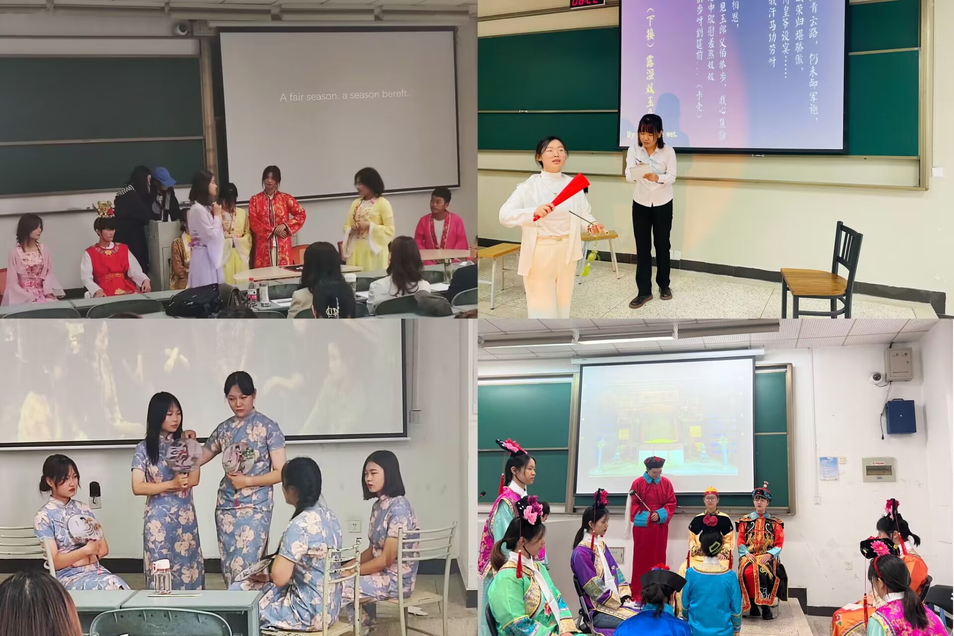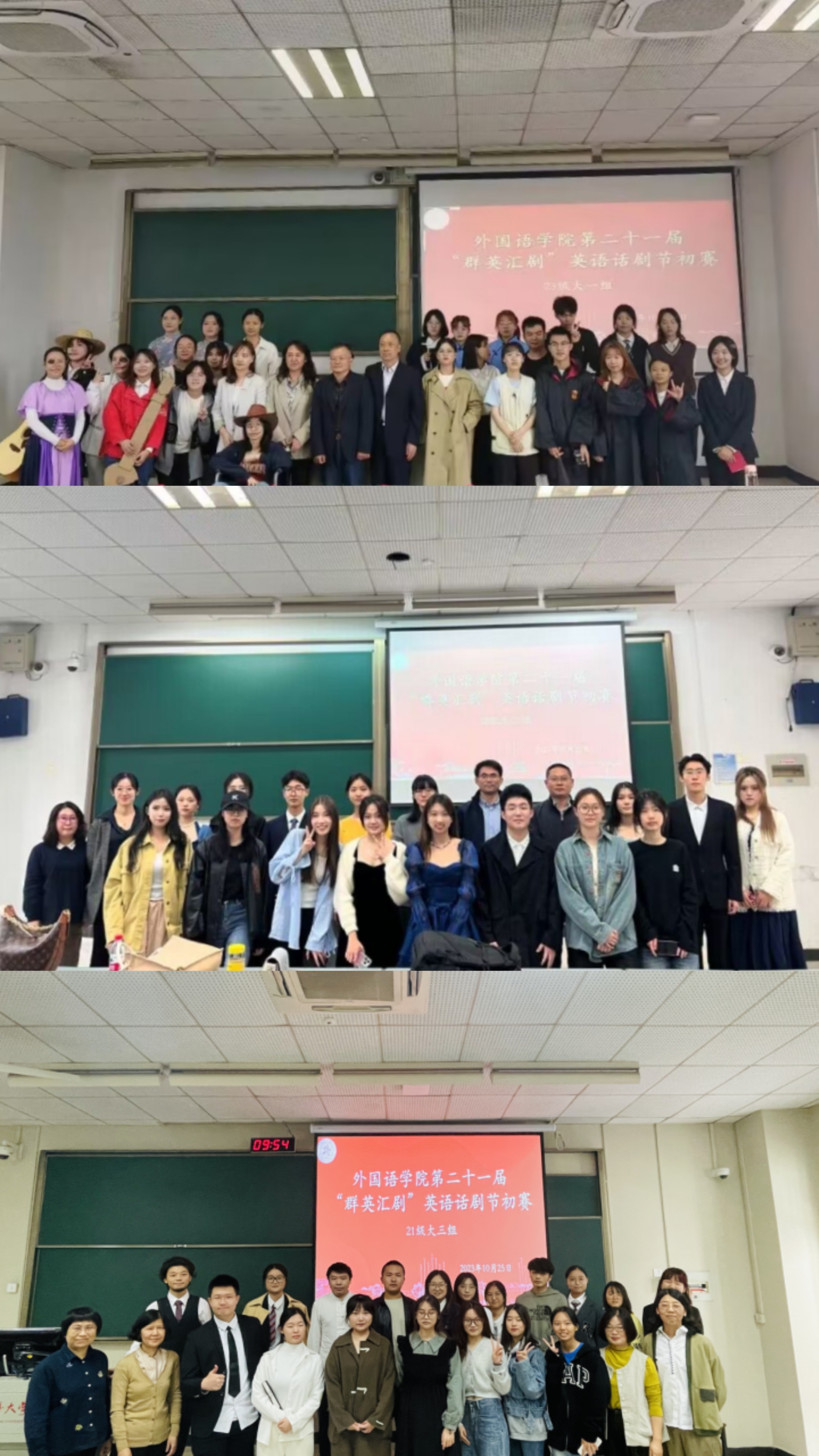 10月25日上午,今年会第二十一届“群英汇剧”英语戏剧节初赛在B111、B313、D312教室有序开展。初赛按照参赛年级分为3组进行,并邀请了公司的12位专业老师担任评委。大一至大三全体同学参与了本次活动。