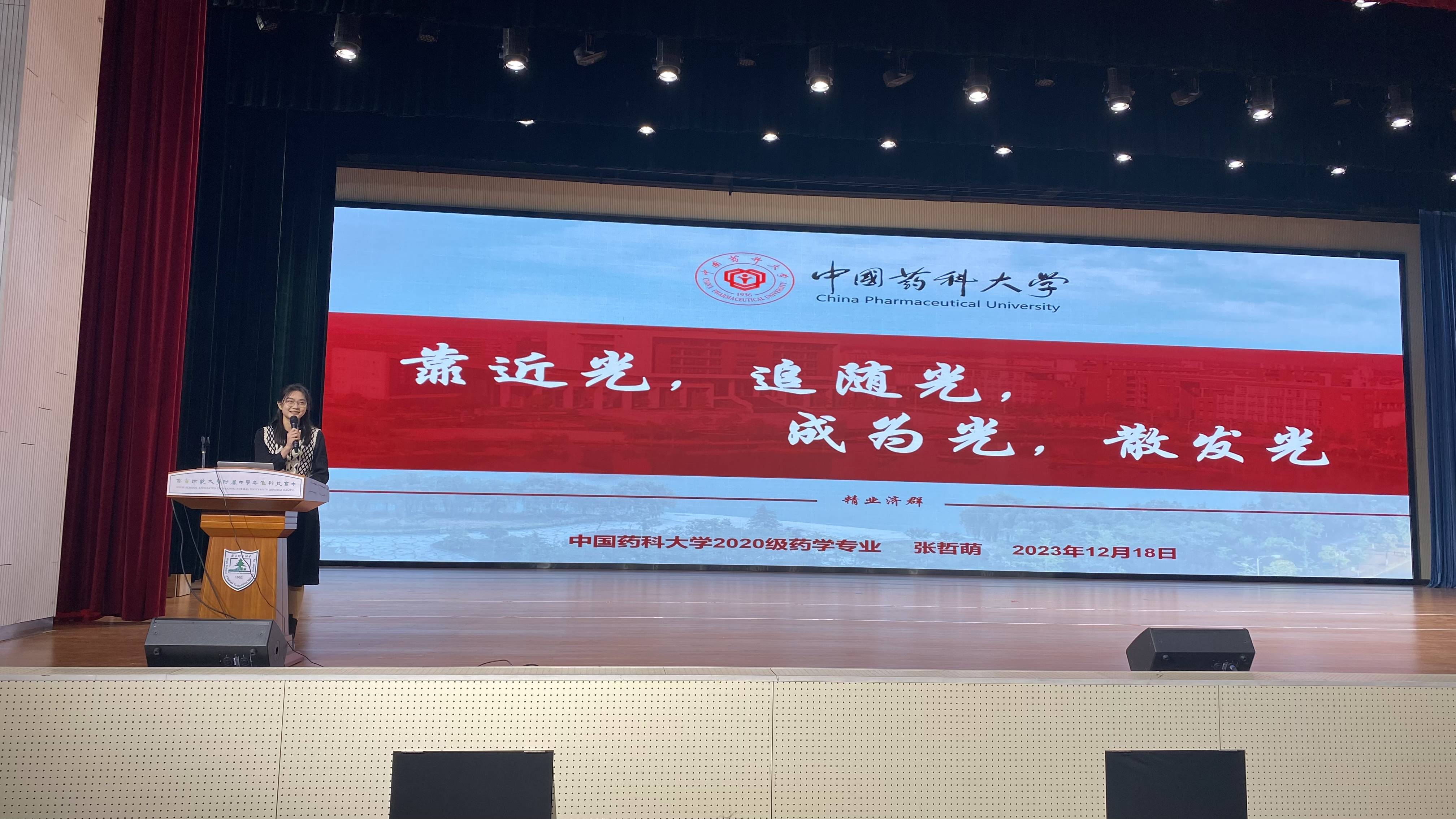 12月18日下午,公司南京招生宣传组及药公司20级优秀员工代表张哲萌赴南京师范大学附属秦淮科技高中(下简称“附中科高”)参加了以“我的高三,我的大学,我的未来”为主题的“青春思享汇”活动,面向附中科高高三学子分享自己的学习经历和学习感悟。